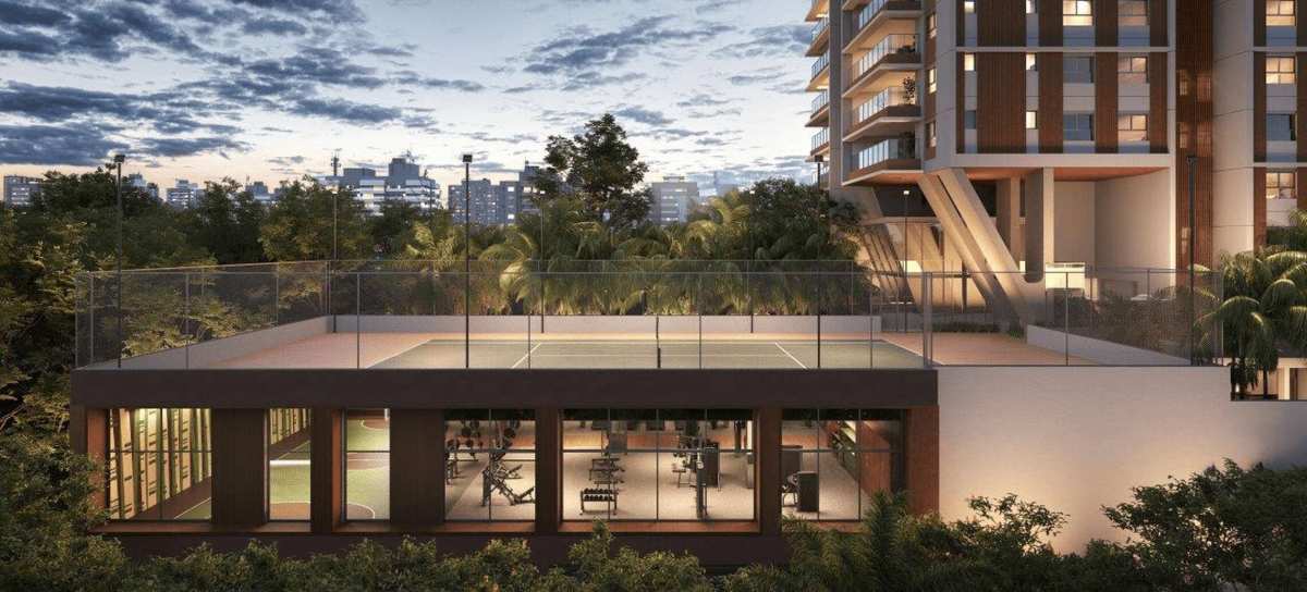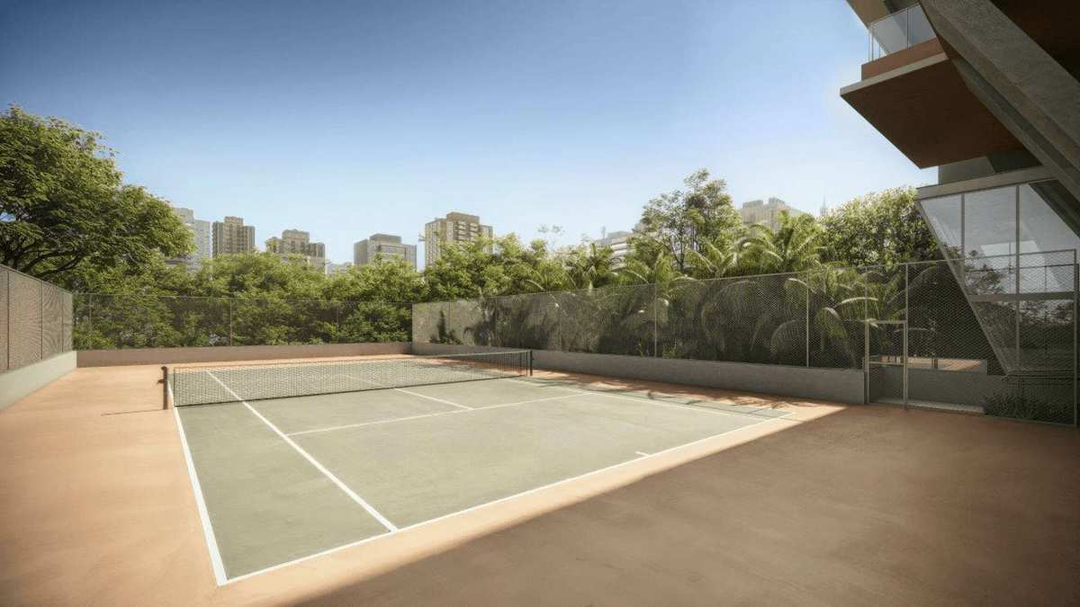 Um edifício contemporâneo, com quadra de tênis com medidas oficiais, cercada por paisagismo e arquitetura atemporal.