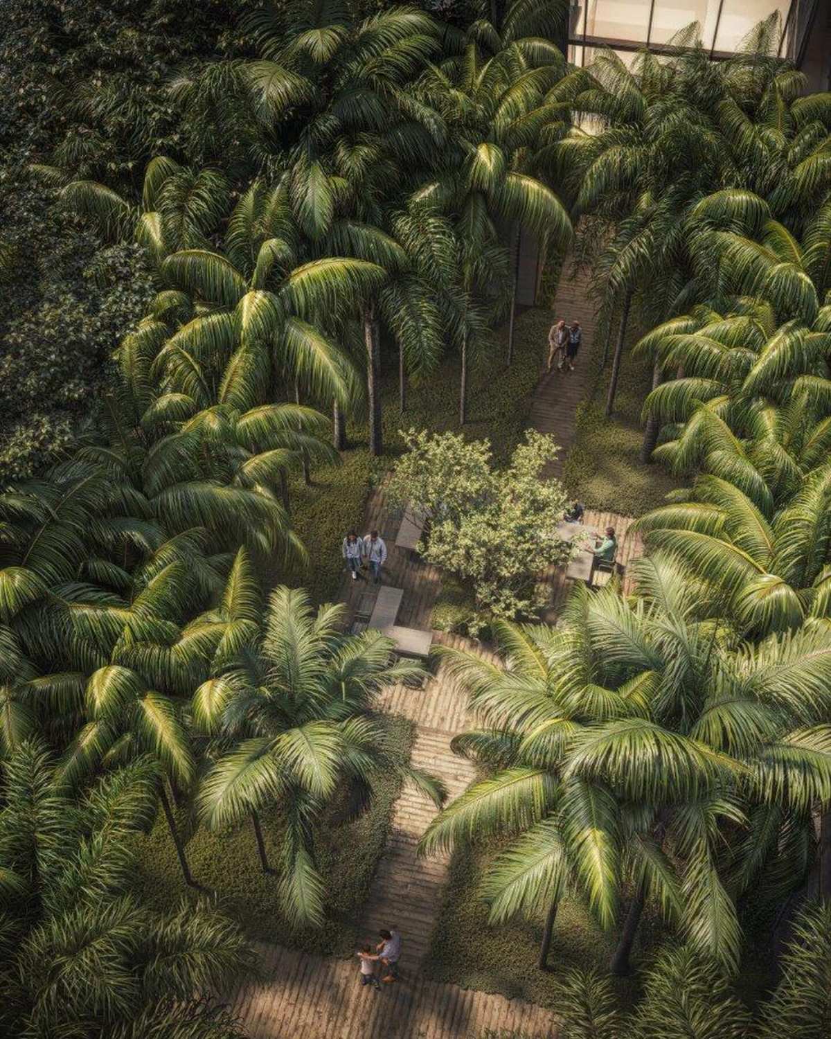 Dentro do edifício, contato direto com a natureza com trilhas sombreadas, árvores nativas e tranquilidade de um bosque privativo preservado e assinado pelo Estúdio Campana, referência mundial em design.